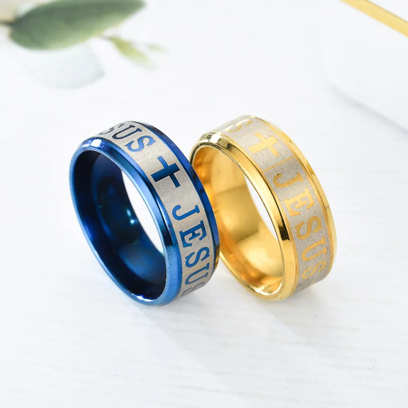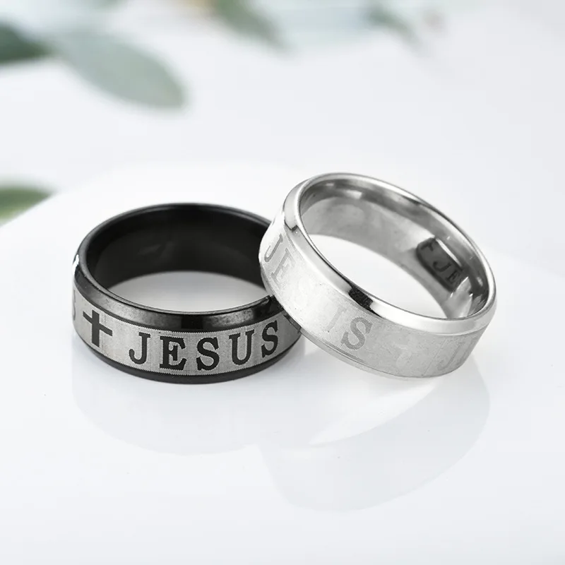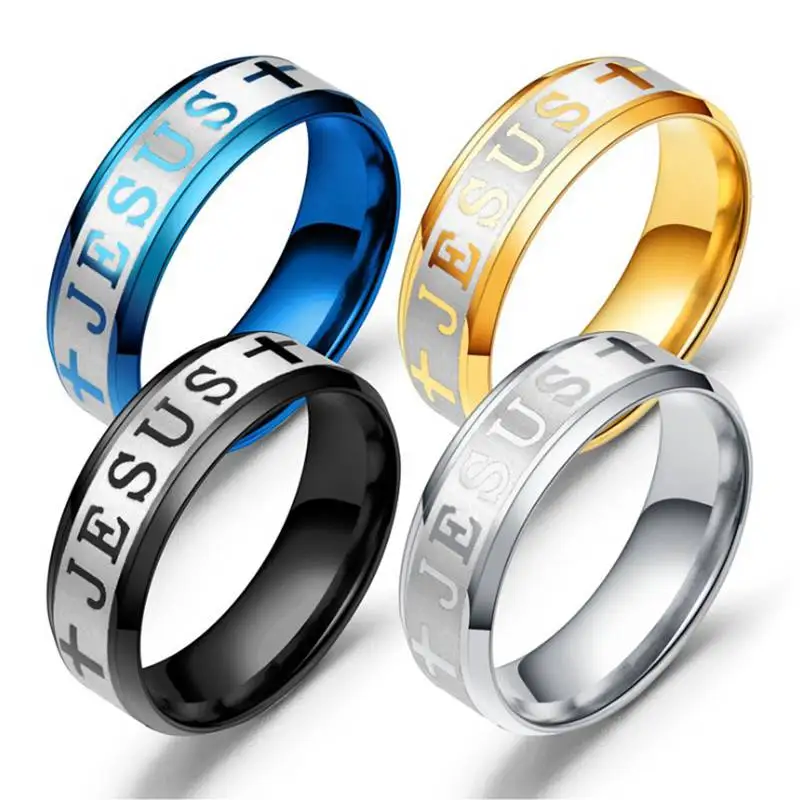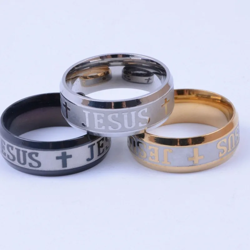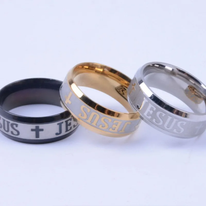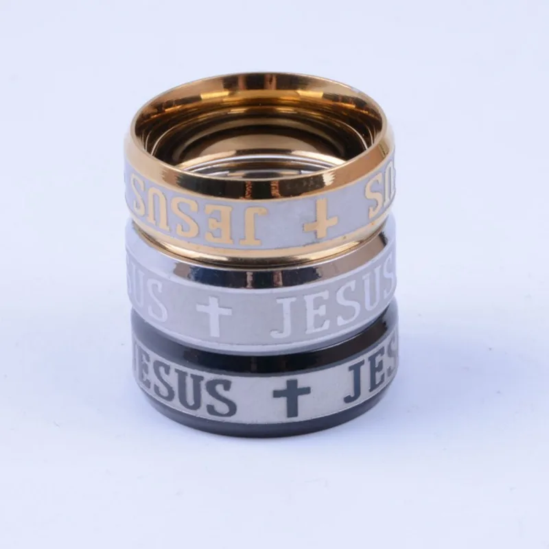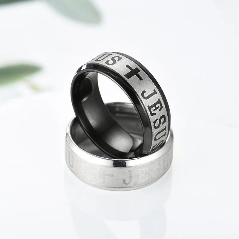 Stainless Steel Black Color Jesus Cross Ring Letter Bible Prayer Finger Rings For Men 8mm Amulet Jewelry